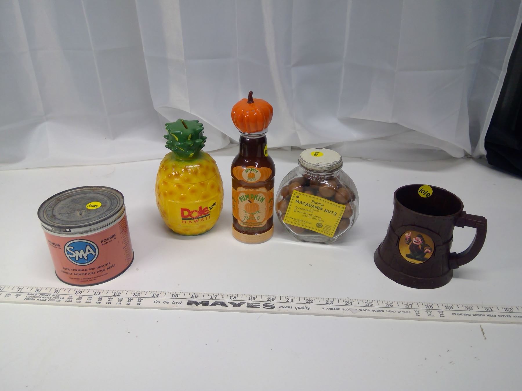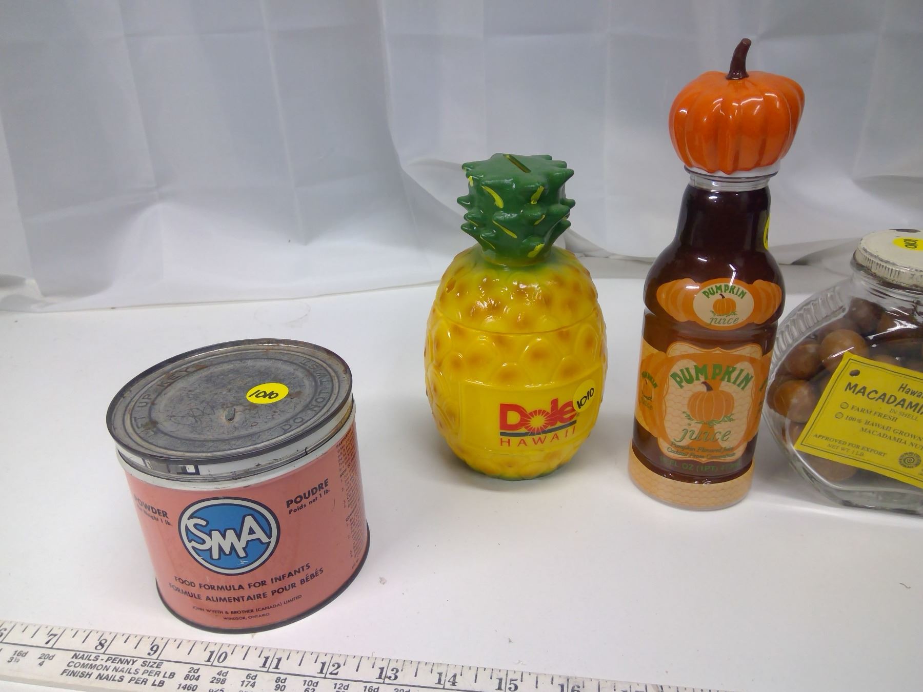 Lot of 5 Misc. Items - Tin, Coin Bank Pineapple, Pumpkin Juice Bottle, Macadamia Nuts, Disney Plasti