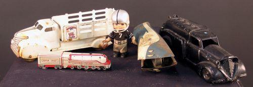 Lot of 5 Misc Toys 2 Tin Trucks plus small tin Locomotive bicycle horn and small wind up Football Player