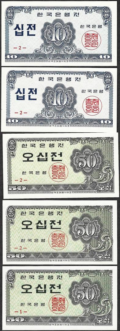 One Lot of (5) Miscellaneous Bank of Korea Currency Notes.