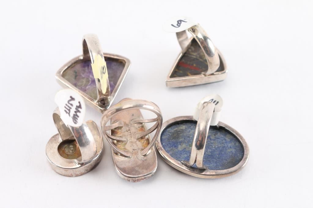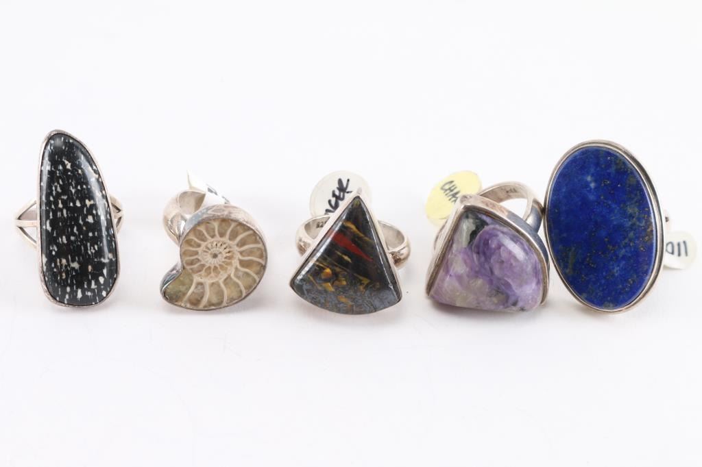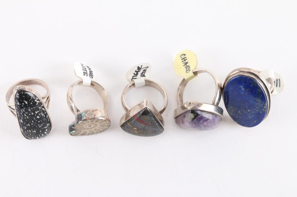 (1) Lapis, large oval, size 7 1/2. (1) Tiger Iron, triangle shape, size 8. (1) Charoite, side triangle shape, size 8 1/2. (1) Snowflake Obsidian, irregular oval, size 8. (1) Ammonite, size 7. All set in sterling silver.