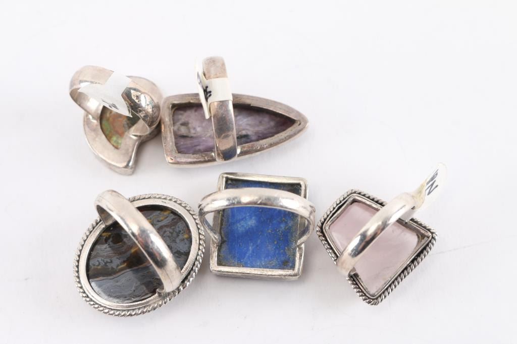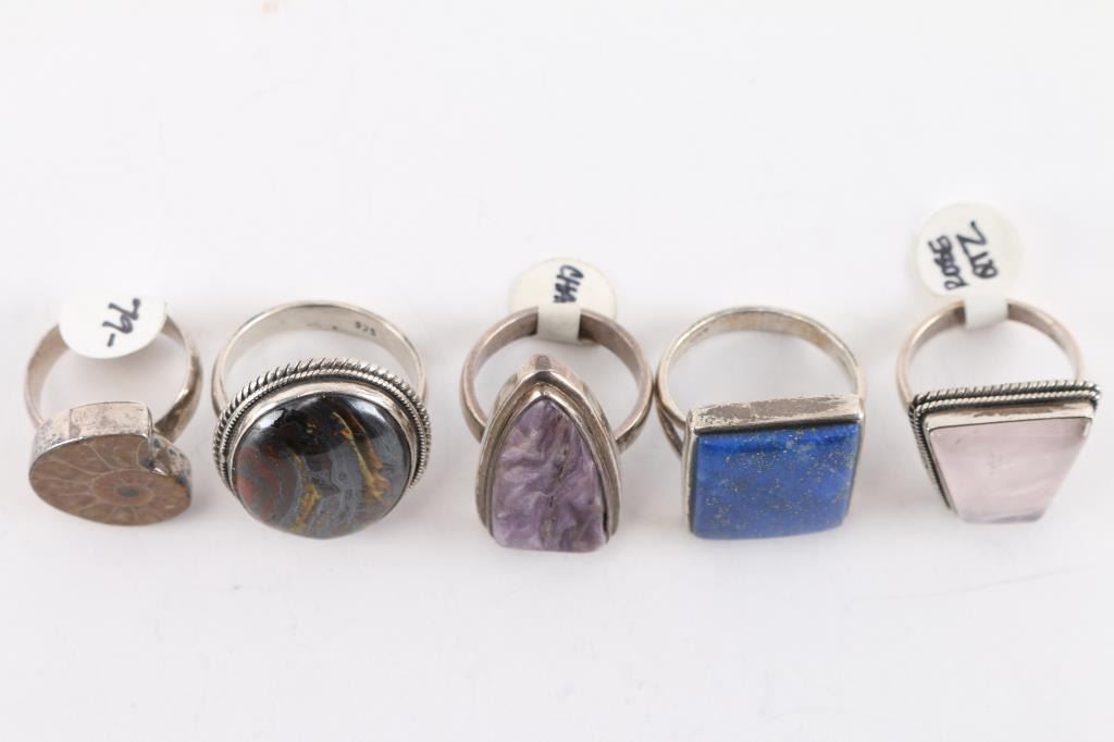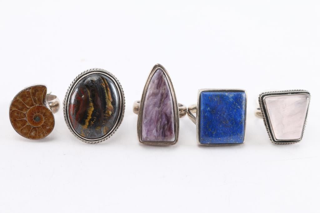 (1) Lapis, large square, size 9 3/4. (1) Tiger iron, large oval, size 10. (1) Charoite, triangle, size 9. (1) Rose Quartz, pyramid shape, size 8 1/2. (1) Ammonite, size 8.Most are sterling silver.