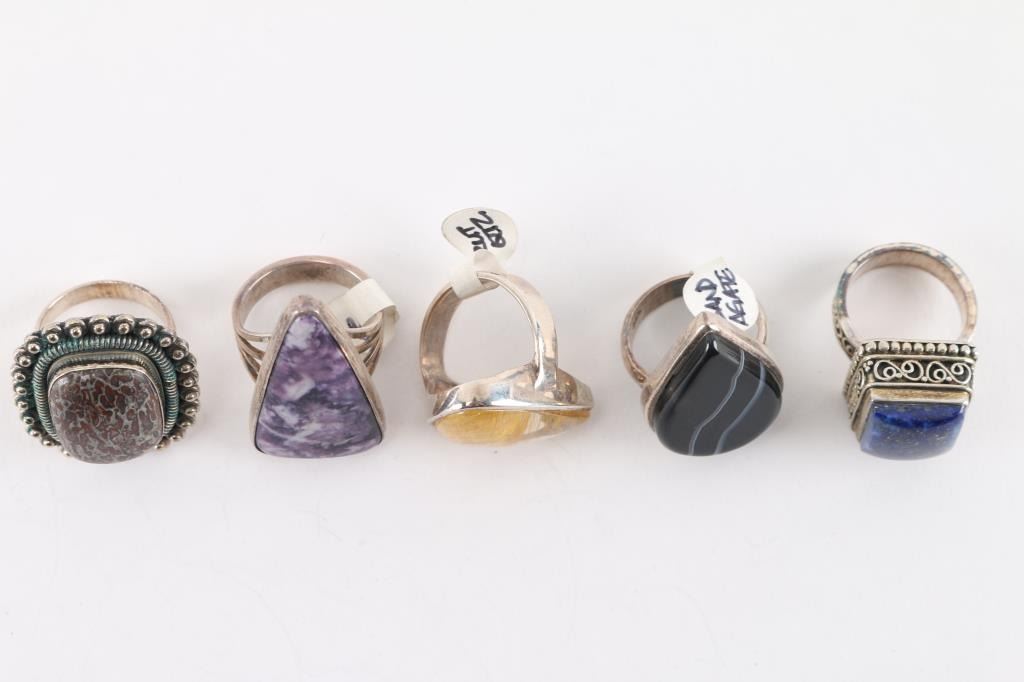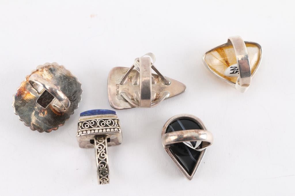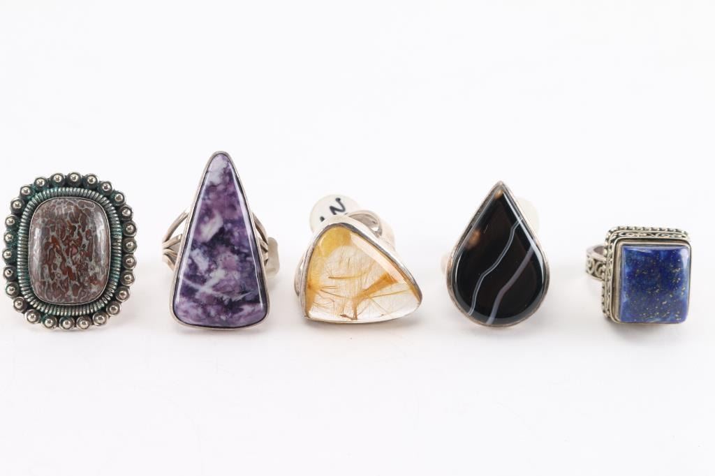 (1) Lapis, square, size 7. (1) Mexican opal, triangle, size 9. (1) Unknown, size 7 1/2. (1) Band Agate, teardrop, size 7. (1) Rutilated Quartz, side triangle, size 6 1/4.Most are sterling silver.