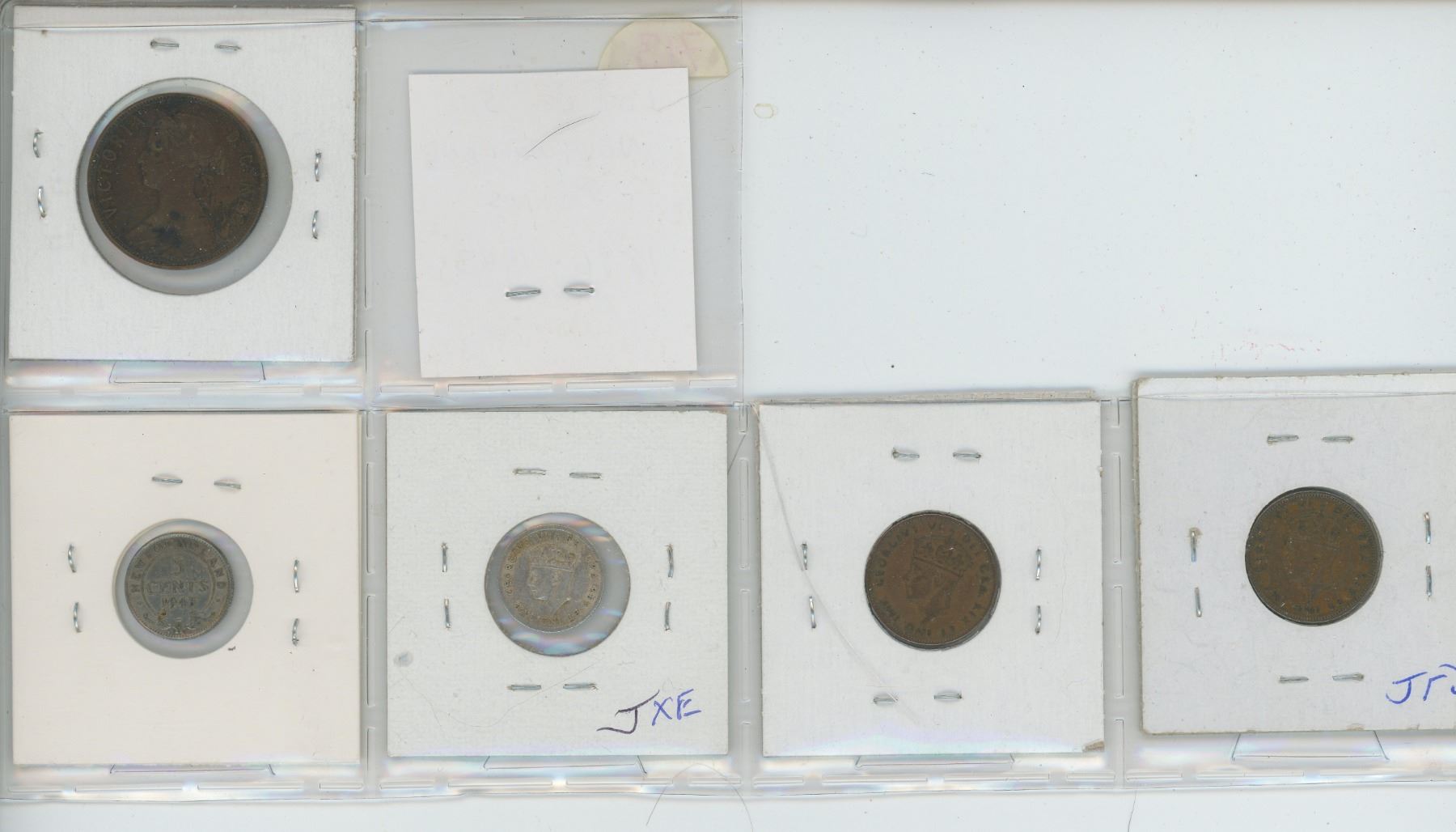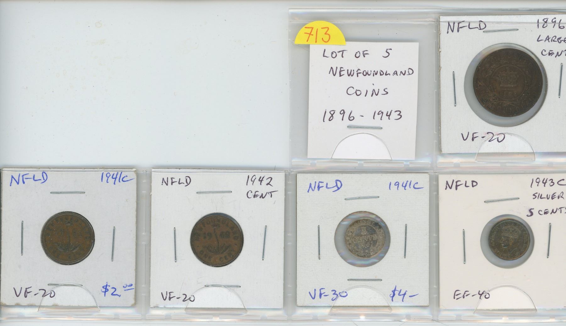 Lot of 5 Newfoundland coins 1896-1943: 1896 1 cent VF-20; 1941c 1 cent VF-20; 1942 1 cent VF-20; 1941c silver 5 cents VF-30; 1943c silver 5 cents EF-40.