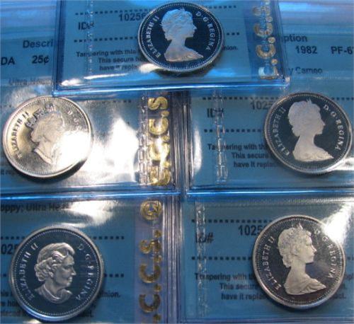 Lot of 5 Nickel 25 Cents all CCCS certified; 1981, 1982 & 2004 Gold Plated Poppy in PF-67 and 1989 & 1994 in PF-68 all Ultra Heavy Cameo.