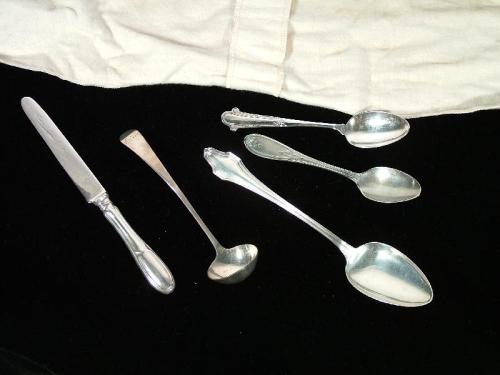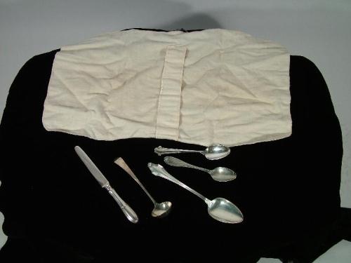 (England 19th Century) One sterling silver fish knife 8" by 1/4"; One small silver ladle, round with initials E.C. in front, 6 1/2 by 1 1/2"; One sterling silver sugar spoon, 5 3/4" by 1 3/4" One WM Rogers sterling silver small spoon, 6" by 1 1/4" ; and One large Hallmark sterling silver soup spoon 8 3/4" by 1 3/4"