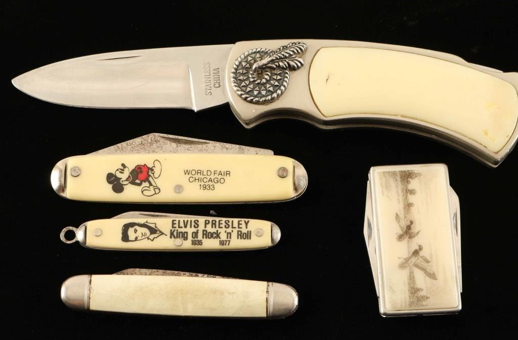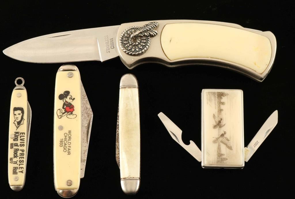 Including; small Elvis Presley knife, Mickey Mouse Chicago World's Fair 1933, bone handle knife, dreamcatcher knife and a waterfowl scene knife that doubles as a money clip.