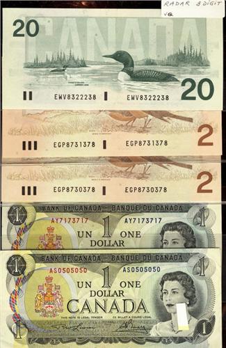Lot of 5 RADAR notes, 1973 $1; AY7173717, AS0505050, 1986 $2; EGP8730378, EGP8731378, 1991 $20; EWV832238. Grades vary from EF+ to Gem uncirculated.