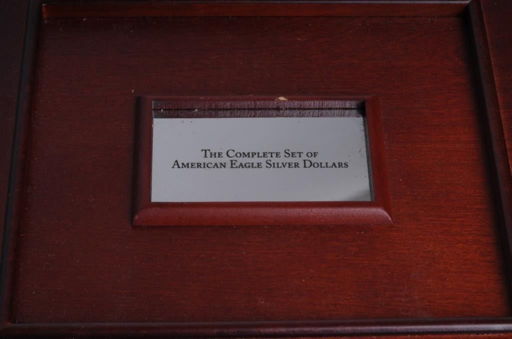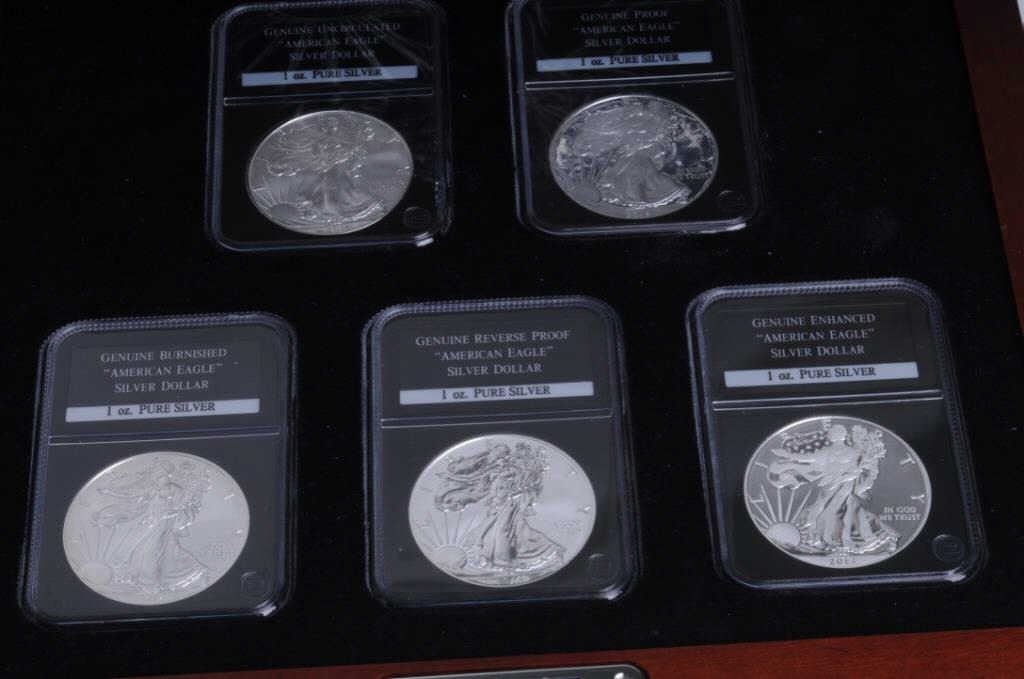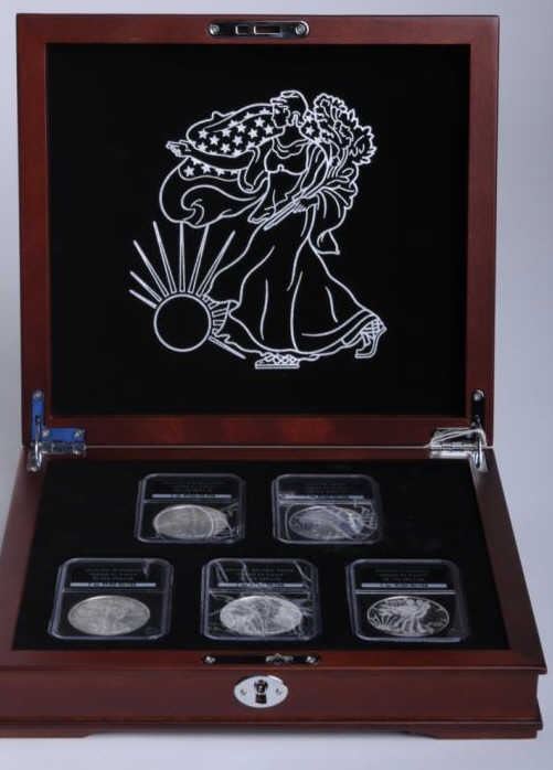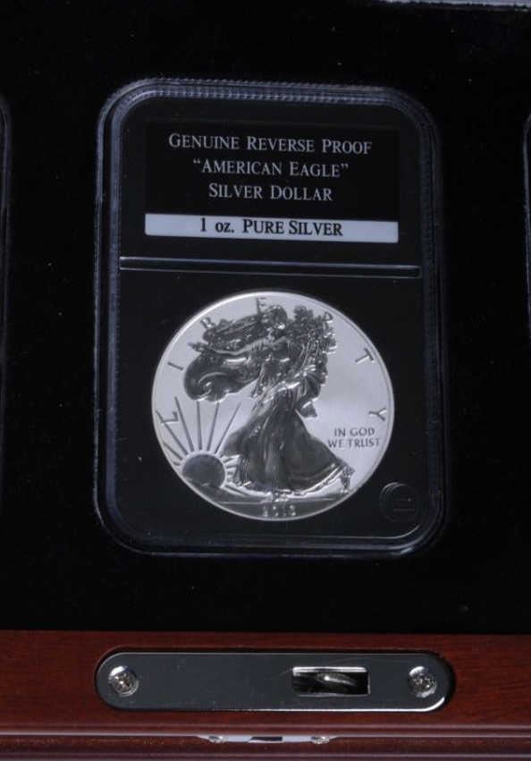 Lot of 5 Reverse Proof “American Eagle” 1 oz. pure silver dollars, slabbed and contained in a beautiful wood display casing; 1 dated 2011; 2 dated 2013 and 2 dated 2014. Est.: $400-$800.