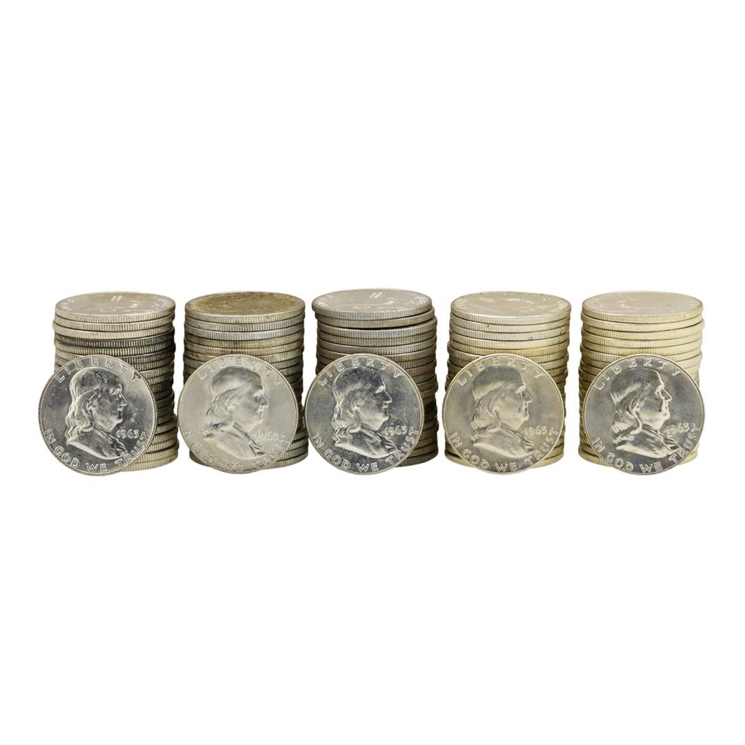 One Lot of (5) Rolls of (20) 1963-D Brilliant Uncirculated Franklin Half Dollars.