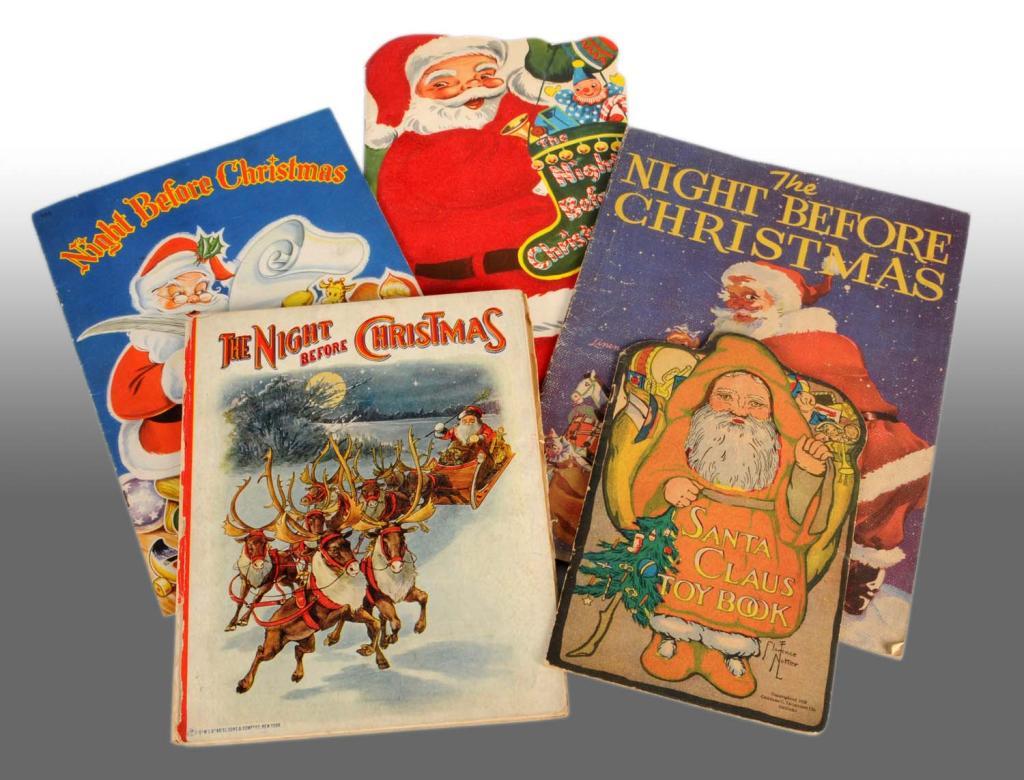 Description Lot contains the "Santa Claus Toy Book", written and beautifully illustrated by Florence Notter and published in 1913 by Charles C. Thompson of Chicago. Nice copy with color illustrations throughout. Lot also includes four "The Night Before Christmas" books. Three are more modern. The other published by Briel Sons & Co. of New York and has several nice color illustrations. Condition (Very Good - Excellent). Size Largest: 15 - 1/2" T.