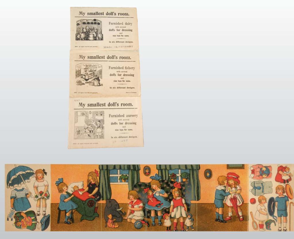 Description ND. Each uncut 3" x 9" set has dolls and accessories to cut and display in front of a background piece. They include a Dairy, Nursery and Fishery. The Nursery and Fishery are duplicated. All the sets are in fine condition with their original envelopes. The envelopes have wear and light staining.