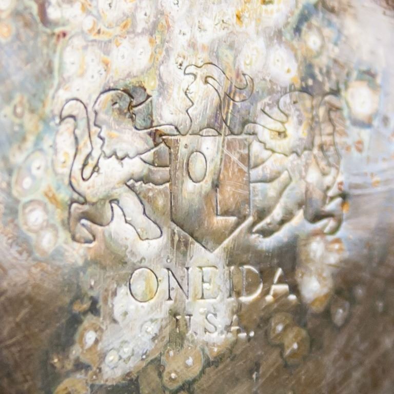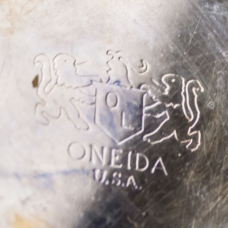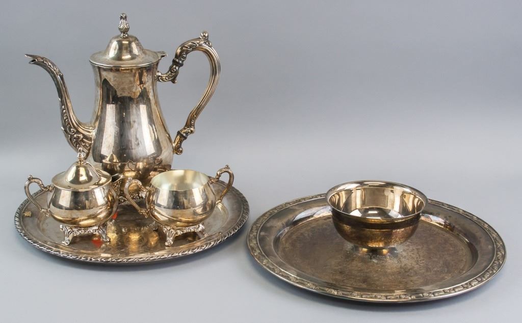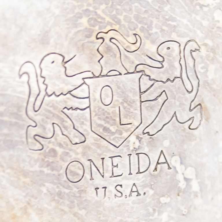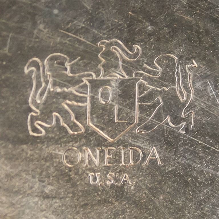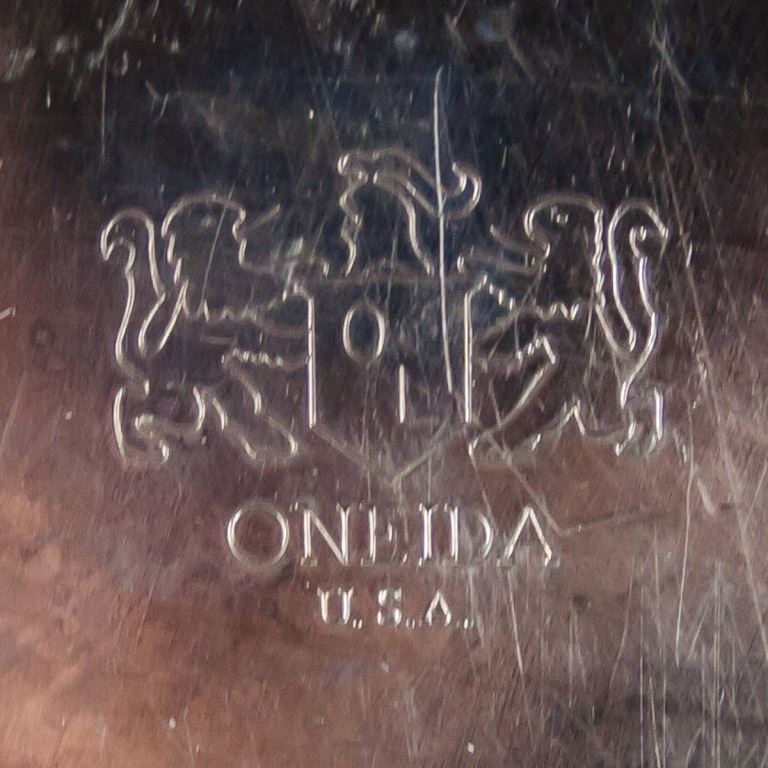 Lot of 5 pieces in a coffee set. Including coffee jug, two small sugar bowls, a tray, and a serving tray with bowl attached. "ONEIDA USA" stamped on base. 27 x 31 cm. 2.5 kg.