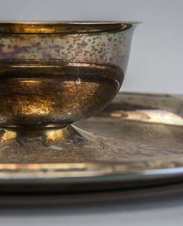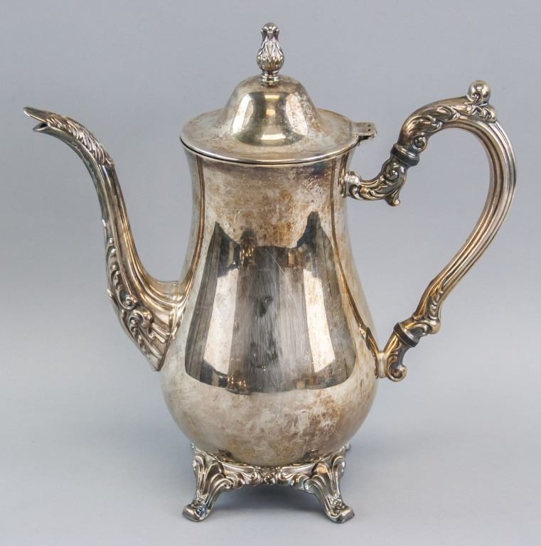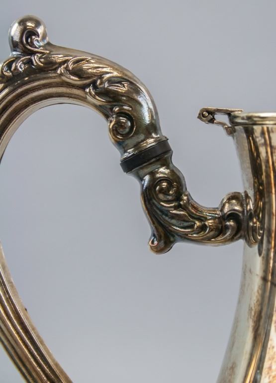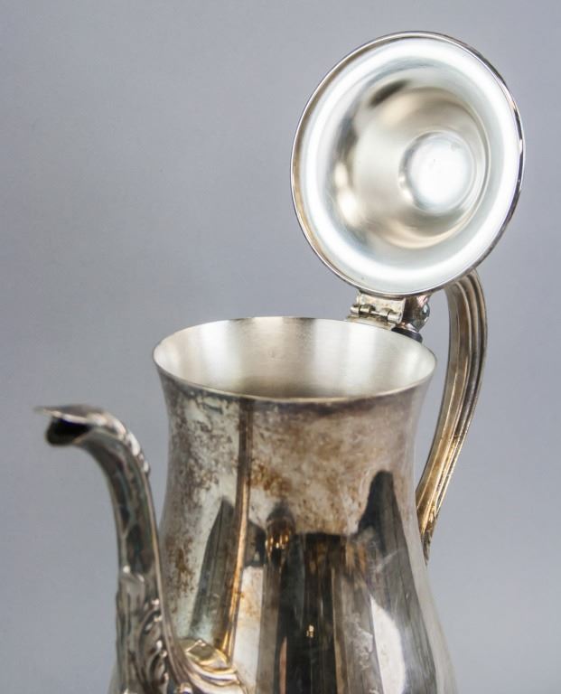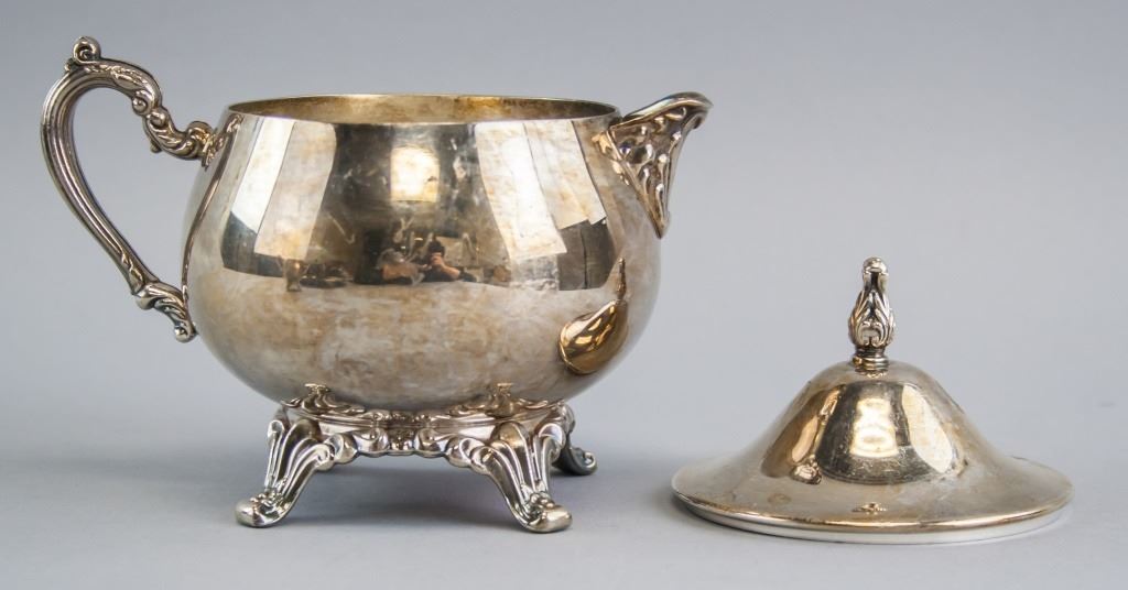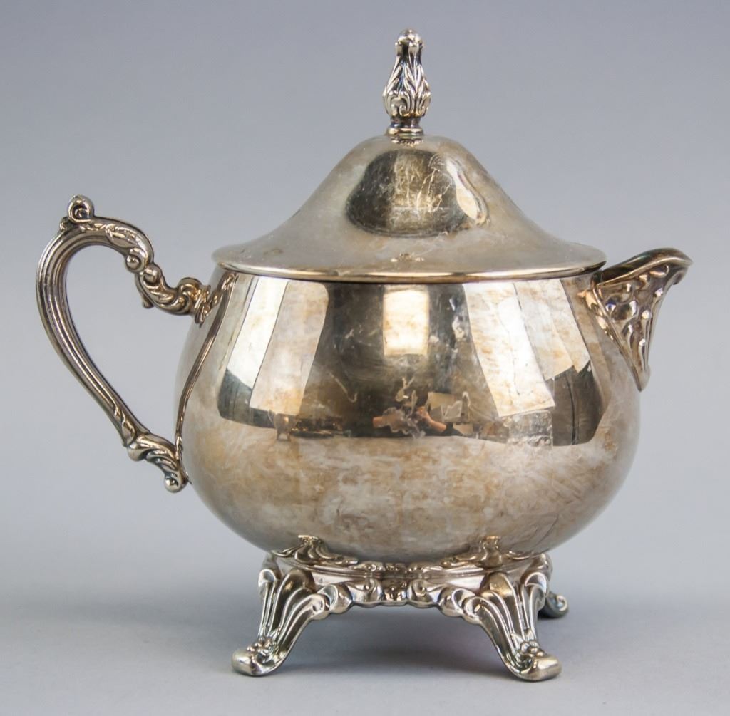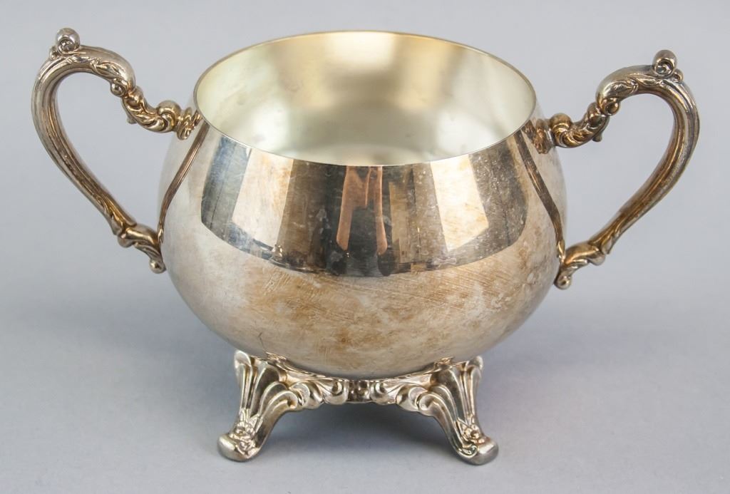 Lot of 5 pieces in a coffee set. Including coffee jug, two small sugar bowls, a tray, and a serving tray with bowl attached. "ONEIDA USA" stamped on base. 27 x 31 cm. 2.5 kg.