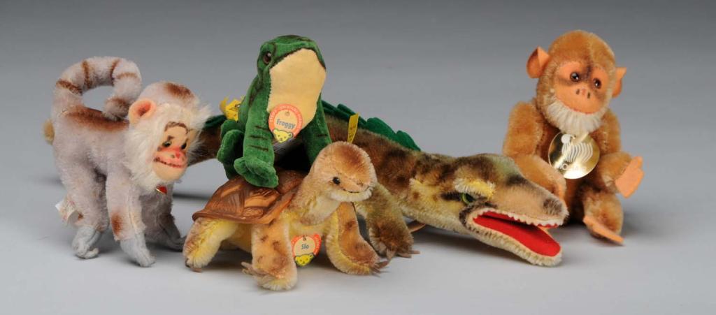 German, various dates. Includes Steiff Froggy #2370/08 with label, button and yellow tag, Slo turtle #2310.00 with label, button and yellow tag, Gaty #2-5 with label, button and yellow tag, Hermann jointed mohair monkey with label and gray mohair monkey with heart. Condition (Excellent). Size Largest: 14" L.
