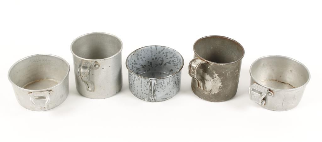 (1) Model 1910 aluminum cup. Handle Stamped "U.S." and "R.I.A. 1913", also stamped below rim "54-75". Approx 2-1/2" tall x 5" diameter. Shows some use and age. (1) Circa 1910. Aluminum construction stamped on handle "U.S." and "R.I.A. 1910". Shows use with crudely etched initials and dents. (1) 1903 Experimental Mess Cup. Blue cup stamped "US" on bottom. This experimental granite ware cup was tested in 1903 but was found to be poisonous when used with acidic foods.2-3/4" tall x 5" diameter. Shows age. (1) Tin mess cup. Circa Spanish-American War era. Handle stamped "US". Shows age. Approx 4-1/4" diameter x 4-1/8" tall. (1) 1906 Soldiers Mess Cup. Aluminum construction stamped on handle "RIA 1906" and "US". Stamped on bottom "W.H.S. 63" Shows use with scratches and dents.