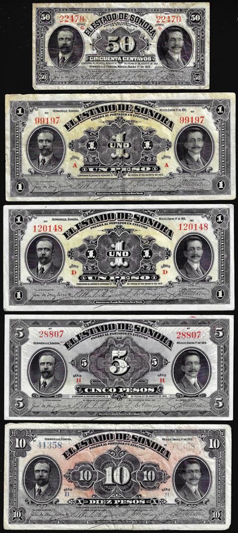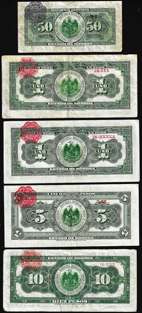 One Lot of (5) State of Sonora Mexico Revolutionary Mixed Notes.