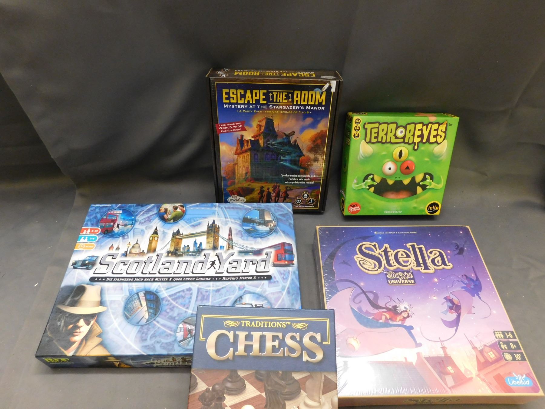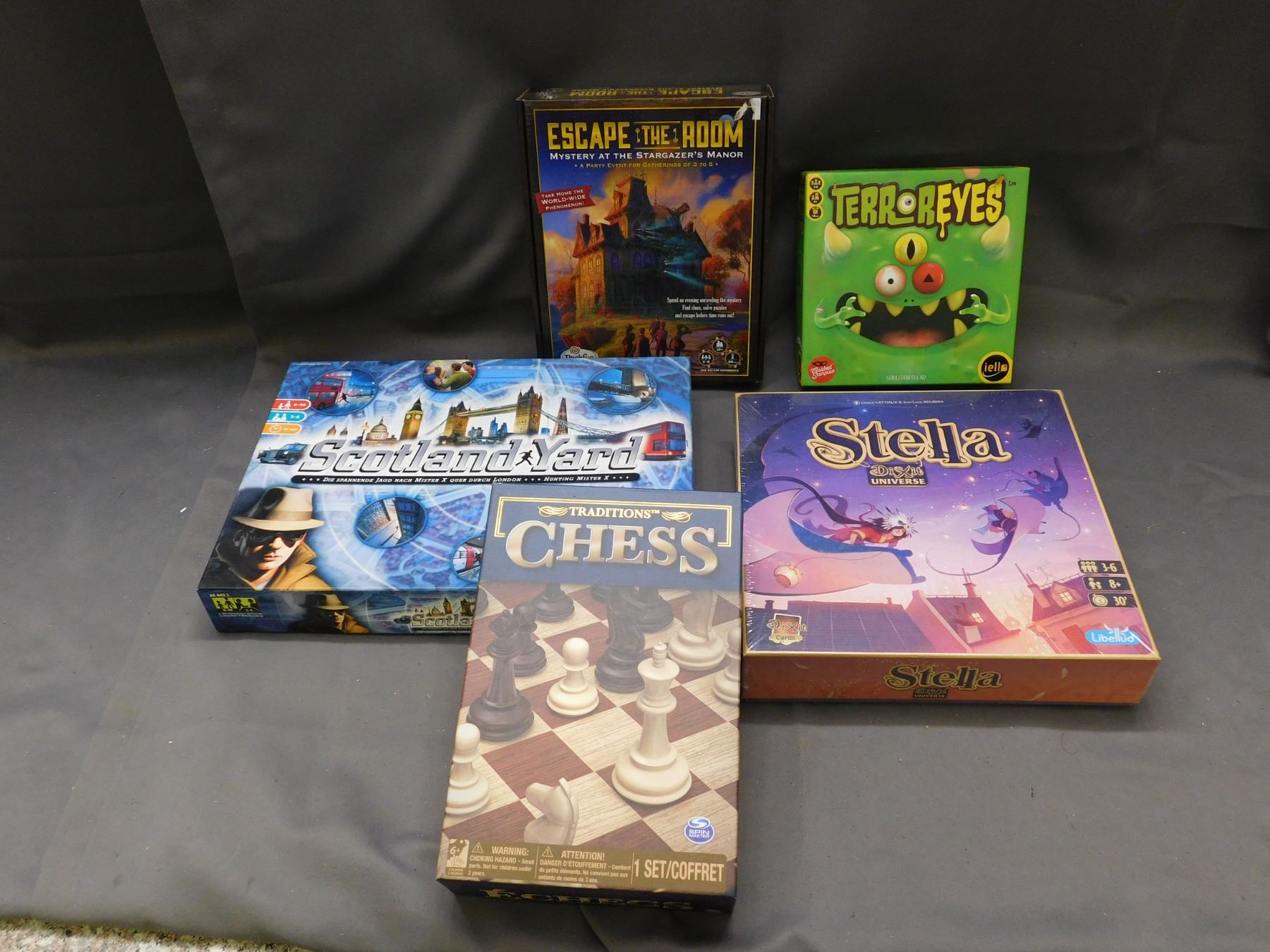Lot of 5 Tabletop Board Games, Stella SEALED Game, Terror Eyes, Chess, Scotland Yard
