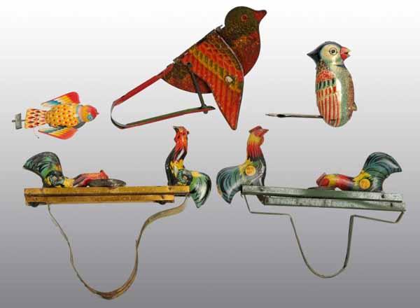 Description Japanese. Pre and post-war. Includes three handheld squeeze toys, one whistle toy, and one flying toy. Beautiful, early lithography. One squeeze toy has working bellows that squeaks. Condition (Very Good). Size Largest: 6" L.
