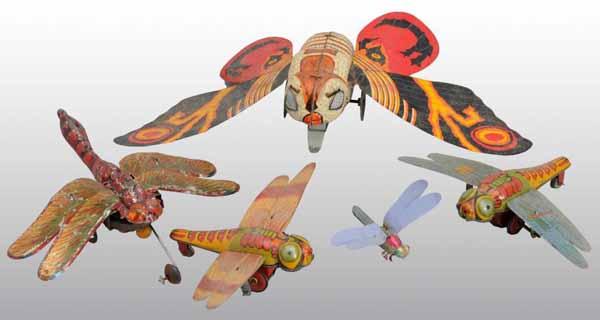 Description Japanese. Smallest toy is a die-cast dragonfly whistle, along with, two friction dragonfly toys, and two larger wind-up toys, one moth and one dragonfly. Very nice lithography. Condition (Very Good). Size Largest: 8" W.