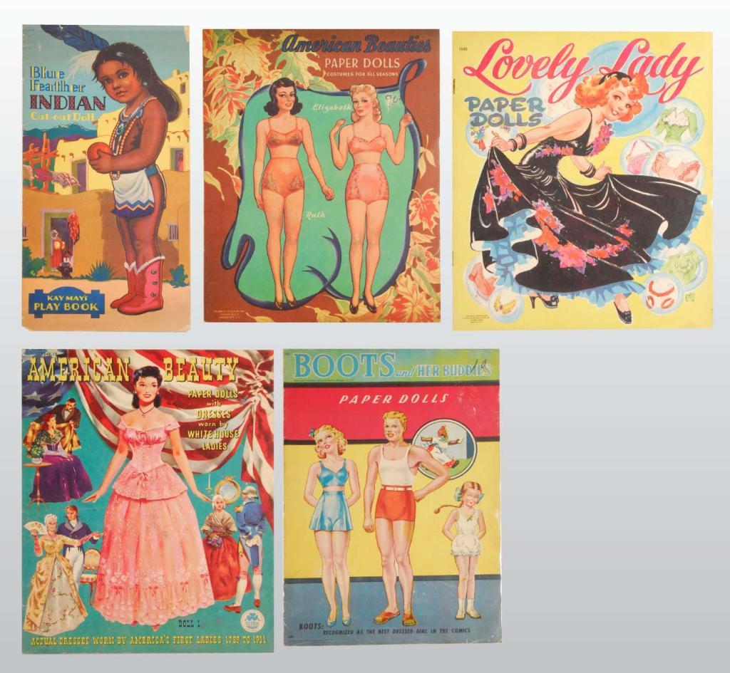 Description Circa 1940s-1950s. "American Beauties", "Lovely Lady", "Boots and Her Buddies", and "Blue Feather Indian Cut-Out Doll" represent a wide variety of 1940s paper dolls. All the books have wear, particularly Boots with cover scrapes, chips, soil and bends that damage the ankles of two dolls. The 1951 "American Beauty" is in very good condition.