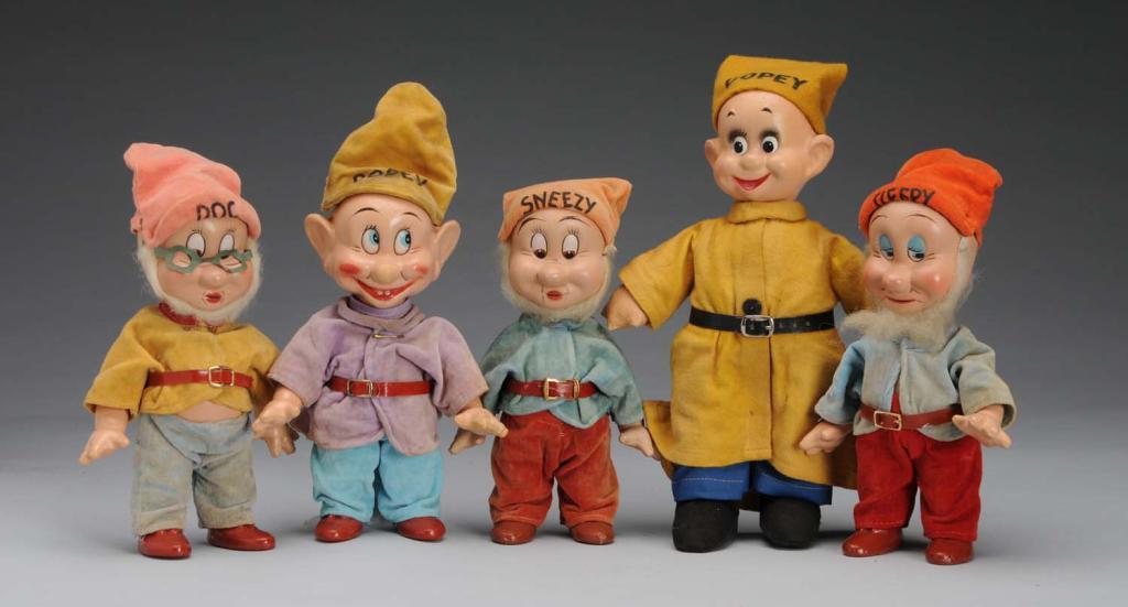 Mismatched set includes one Sneezy, one Doc, one Sleepy and two Dopeys. All have original hats and belts and Doc has original glasses. Some staining and fading to hats and clothing with some slight crazing to composition faces and back of Sneezy's head. Condition (Excellent). Size Largest: 12" T.