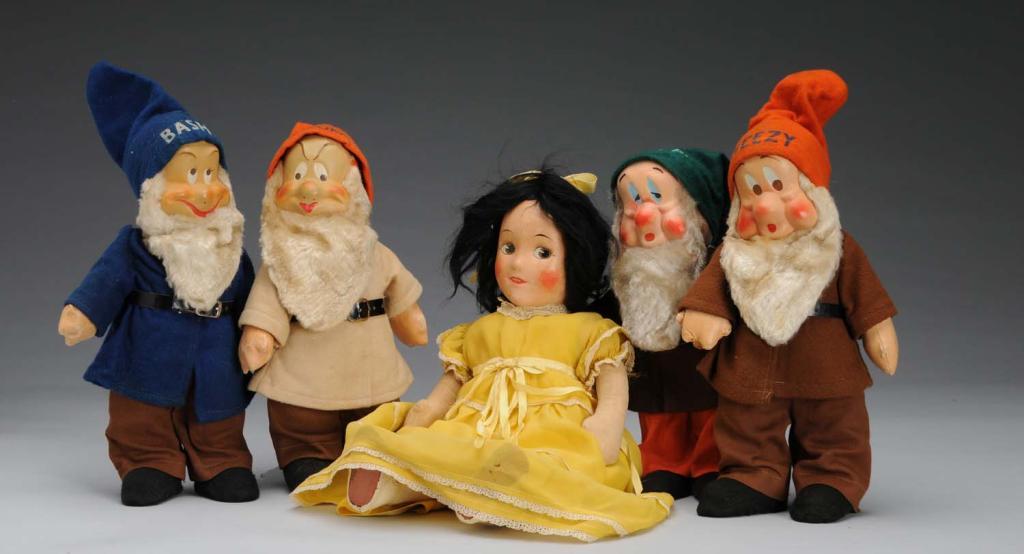 Unmarked except for names on hats. Dwarfs includes Sleepy, Grumpy, Bashful and Sneezy. Papier mache faces with felt and cloth-covered bodies. Some soiling to beards. Condition (Very Good). Size Largest: 16" T.