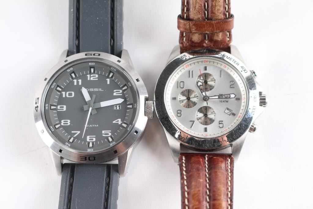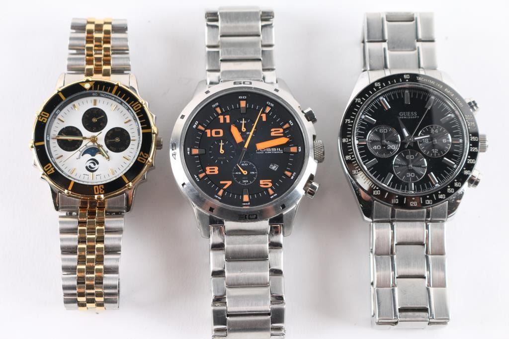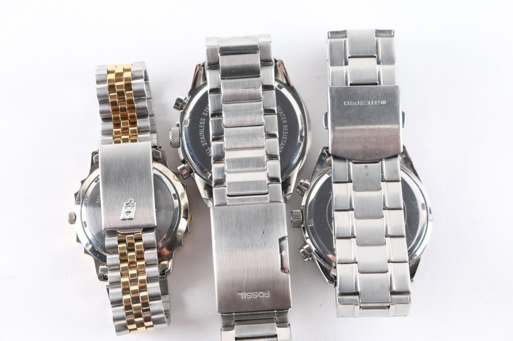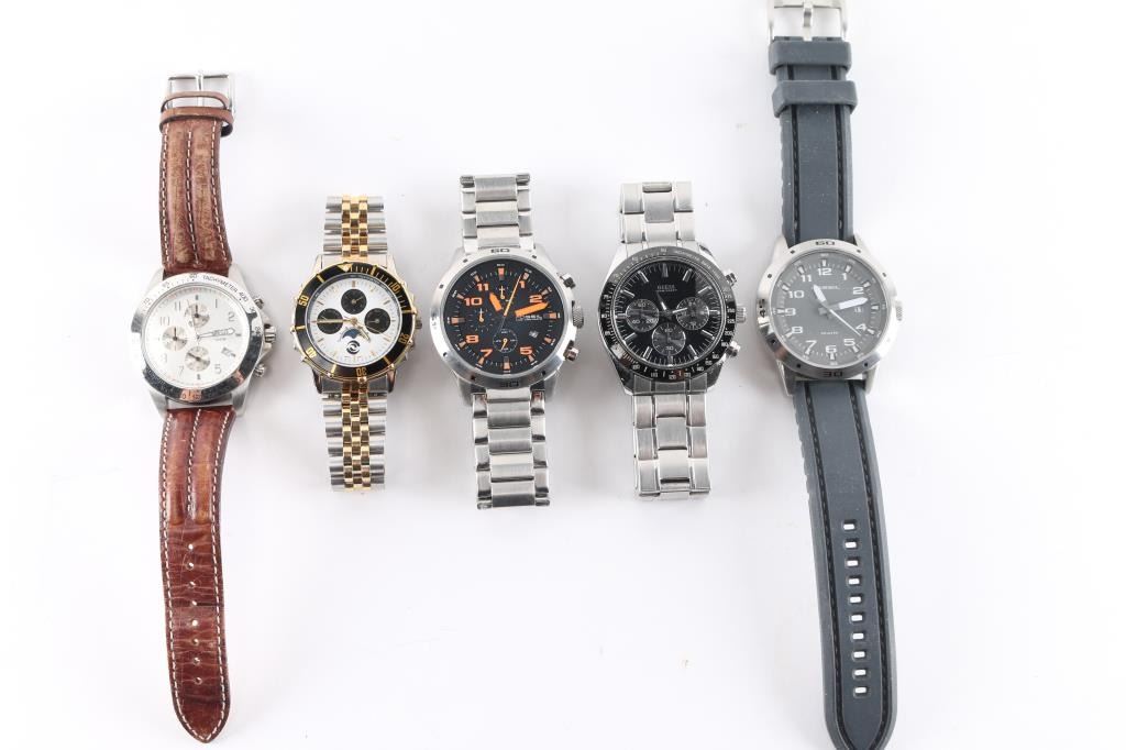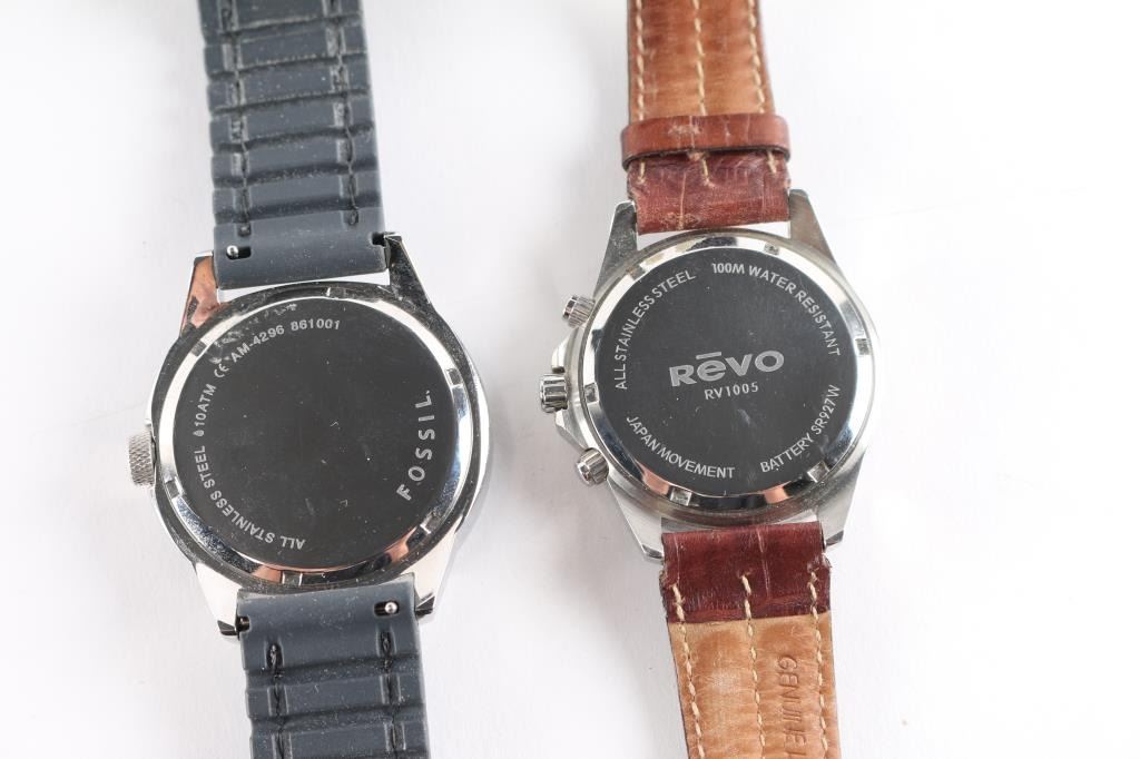Includes: Guess Waterpro, Fossil CH2519 Chronograph, Fossil AM4203, Revo RV1005, Japan made gold tone/ silver tone.