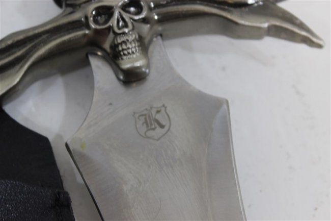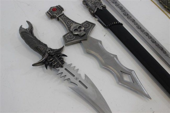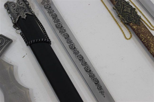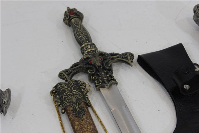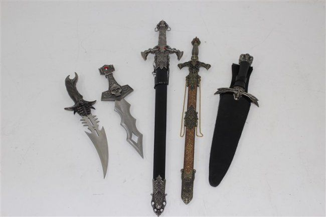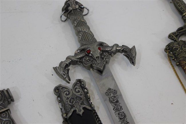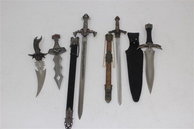 short sword approx 29" , short sword approx 24", 3 daggers 1 with leather sheathe approx 19" , approx 15", approx 16"