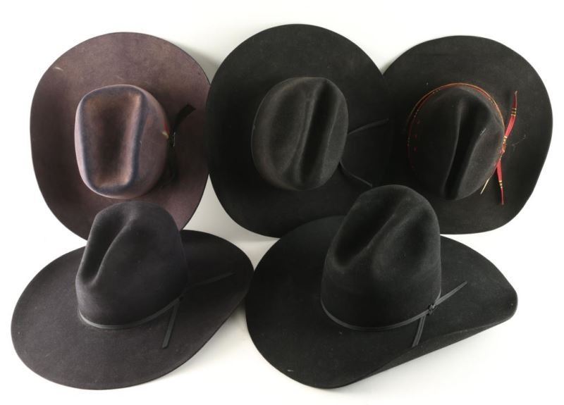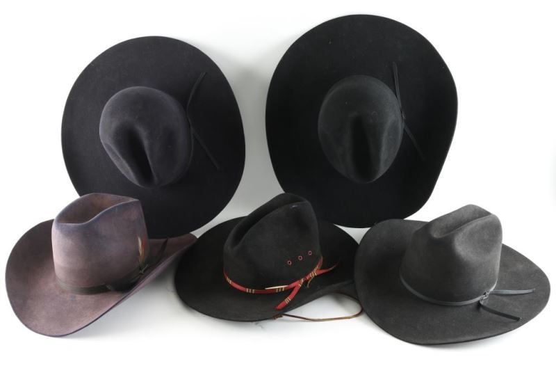 includes (2) size 7-1/4 black felt by "Rodeo King", size 7-1/8 black felt "XXXX Stetson" with red/yellow band, black felt Resistol size 7-1/8, size 7-1/4 gray (almost blue color with some fading) felt "XXXX Stetson". Condition ranges from good to very good.