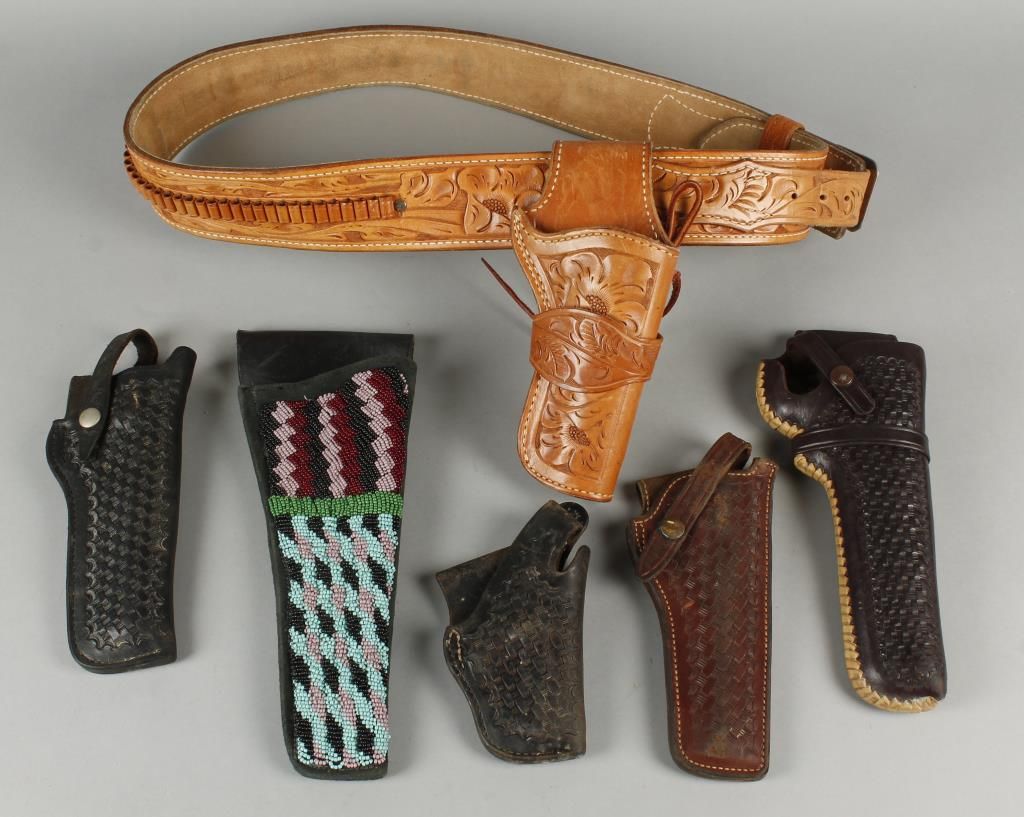 Including: a hand tooled holster rig for a Colt SAA , a Native American fully beaded holster, an Idaho leather company basket weave holster, a Bacon K22 basket weave holster, a Bacon M19 holster, and a SafariLand basket weave holster for a Smith & Wesson.