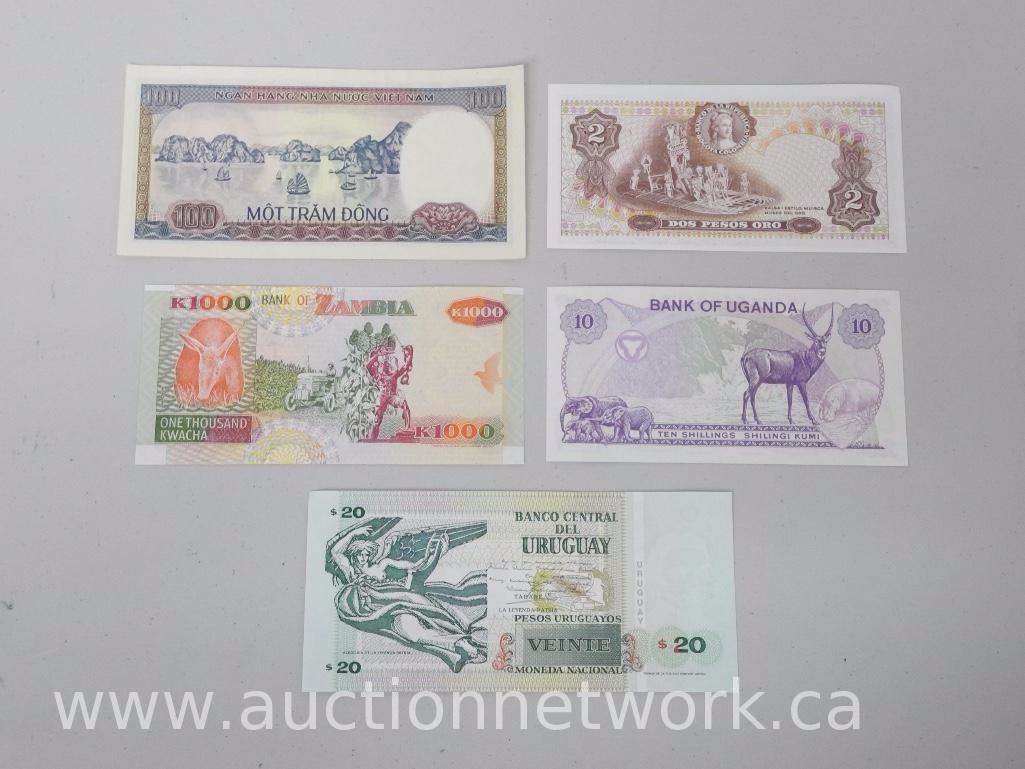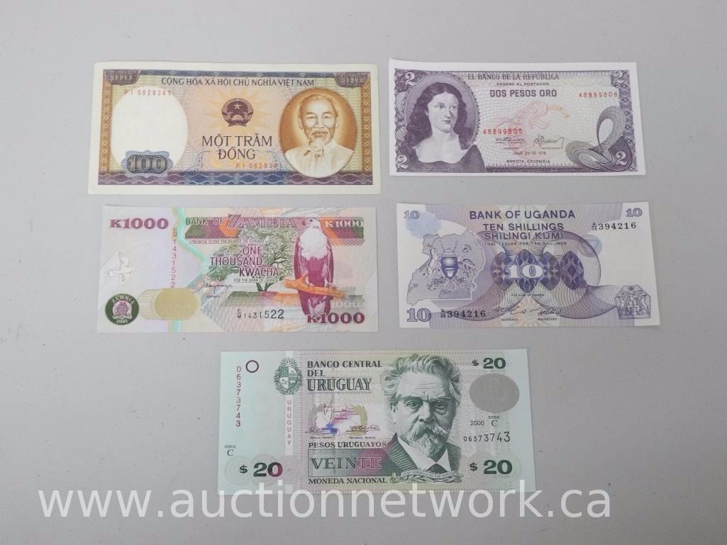 Lot of (5) World Bank Notes - Uruguay, Uganda, Colombia, Zambia and Vietnam