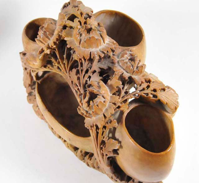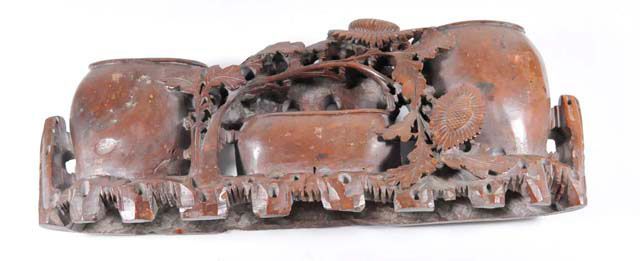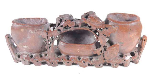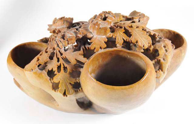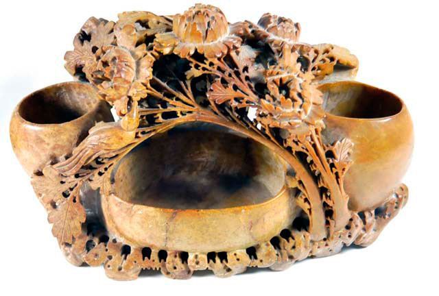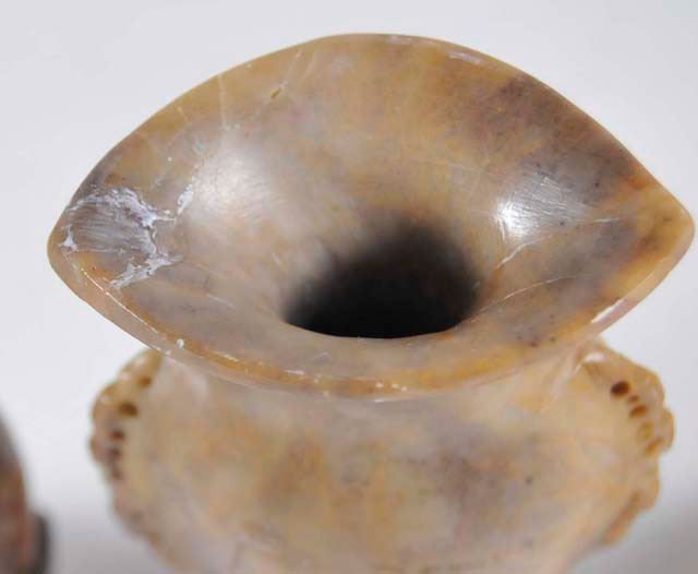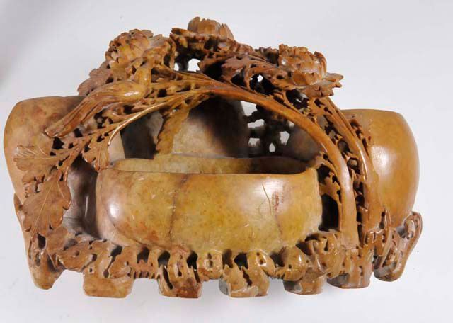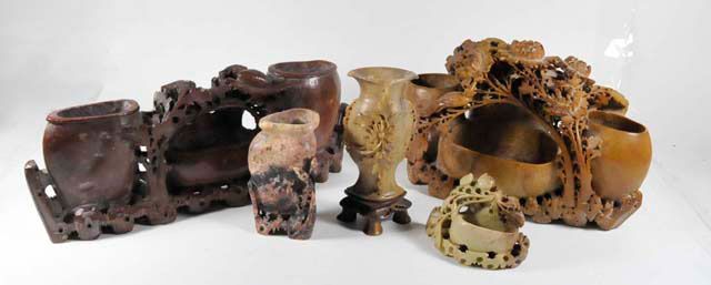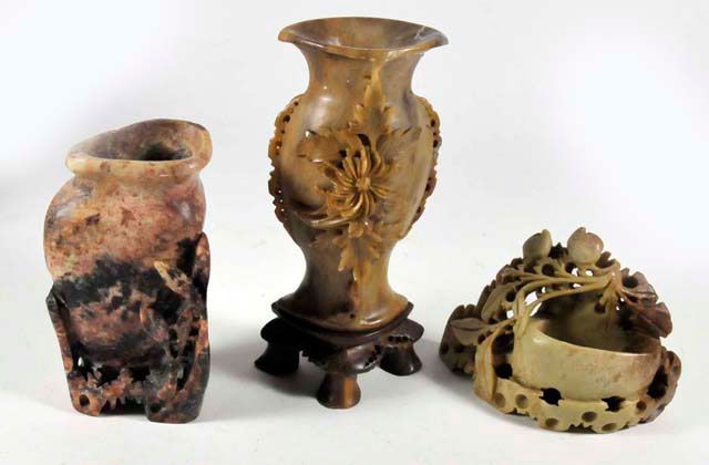 All with vases & bowls, each has intricate carving from one stone. Approx. 10.5" L x 7" H x 6" D, 13.25" L x 5" H x 1.75" D (some cracks), 6" H (repair to rim), 5" H & 4" H. Please read our terms of sale.