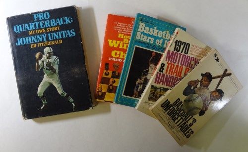 Hardback - Pro Quarterback: My Own Story by Johnny Unitas and Ed Fitzgerald (1965), Paperback - 1966 Baseball's Unforgettables Book Yankees 'Mantle' Giants 'Mays', 1970 Motorcycle & Trail Biking Handbook, Basketball Stars of 1969 Berry Stainback, and paperback Fred Reinfelds: How to Be a Winner at Chess. Est. Value $35.00 - $50.00.