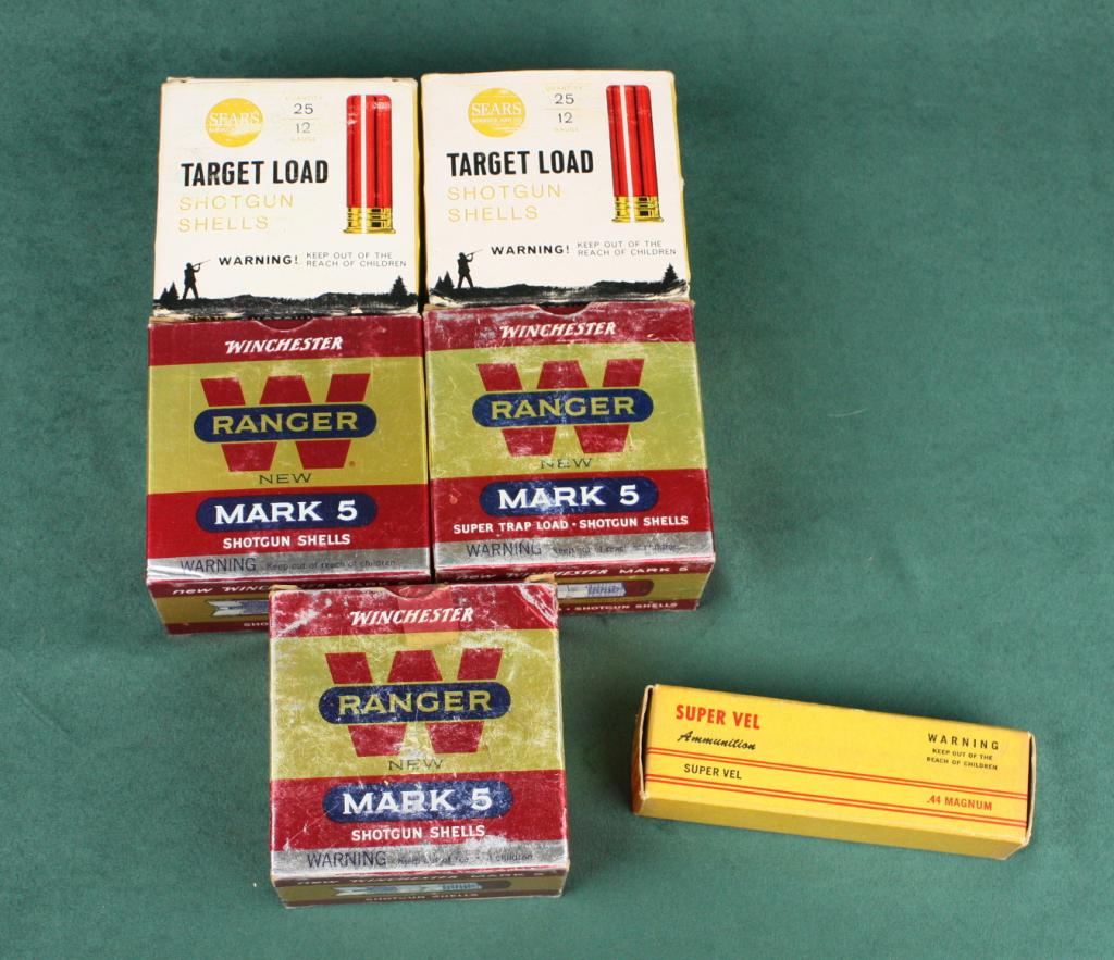 Lot of 5 boxes of shotgun shells including  three Winchester Ranger Mark 5 boxes of 12  gauge (25/box) and two boxes of Sears Target  Load 12 gauge (25/box); also a very  collectible box of Super Vel .44 magnumcartridges  (20 in box) in very good  condition.  Est.:  $50-$100.