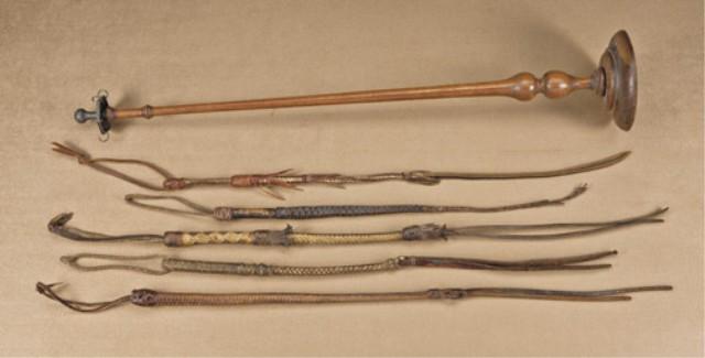 Lot of 5 braided leather quirts in good condition, all showing age and use. Along with a nicely made stand for these leather quirts from associated antique wood and metal parts. Makes a great display. Est: $200 - $400