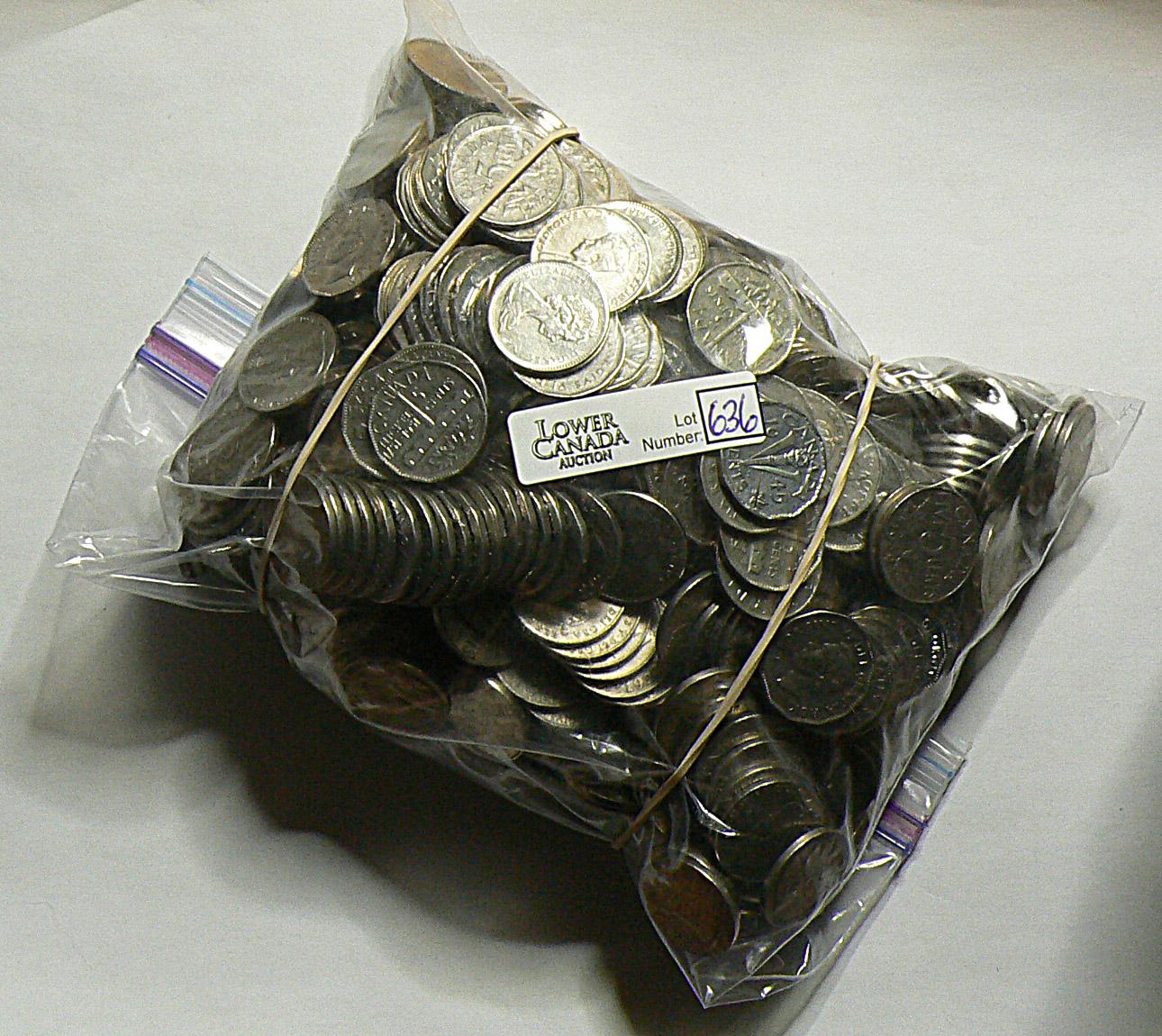 Lot of 5 cents, 1922, 1923, 1924, 1927, 1928, 1929, 1930, 1931, 1932, 1933, 1934, 1935, 1936, 1944, 1945, 1947, 1951, 1951 comm, 1952, 1953, 1954,1967. 3 bags. 3099Gr, about 680 pces, About 34$ face value.