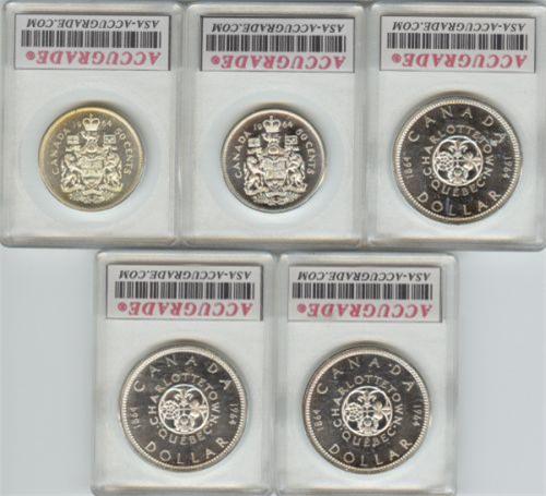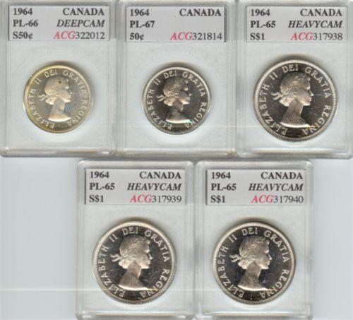50 Cents 1964 PL-66; Deep Cameo, 50 Cents 1964 PL-67, 3 X 1 Dollar 1964 PL-65 Heavy Cameo. Lot of 5 coins all certified by ACG.