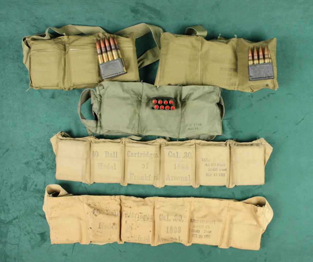 Lot of 5 collectible U.S. military ammunition in bandoliers including two bandoliers with clips of ammo for the M1 Garand rifle; a bandolier of .30 caliber 8 round clips of M1909 blank cartridges; a tan bandolier of.30 caliber ball cartridges from the Frankford Arsenal for the Model 1898 rifle dated Sep. 12 1907 and a partial bandolier of the same dated Oct. 20 1905. Est.: $150-$300.