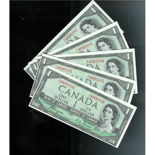 Lot of 5 consecutive Devil's face 1954 $1 Coyne-Towers BC-29a E/A4809182 to 186. All notes Choice Unc.