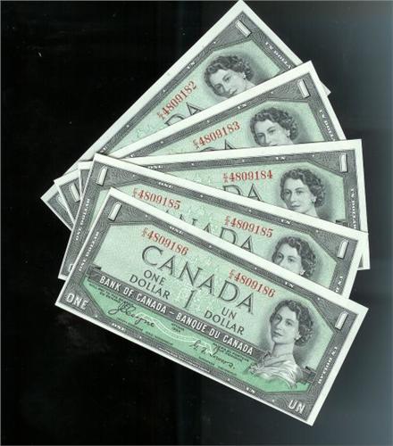Lot of 5 consecutive Devils face 1954 $1 Beattie-Coyne BC-29a E/A4809182 to 186. All notes Choice Unc.