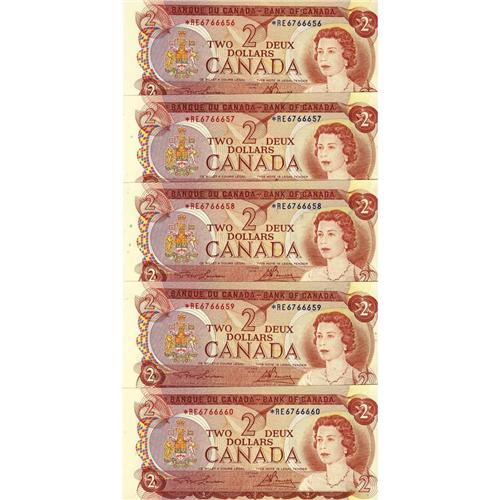 Lot of 5 consecutive numbered notes, 1974 $2 Law-Bou *R/E6766656. All Gem's