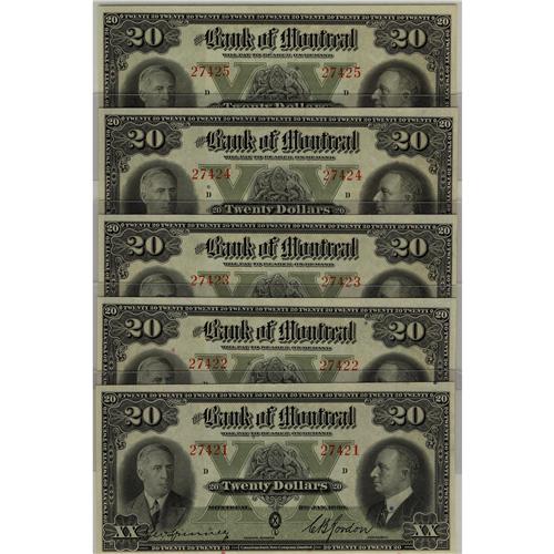 Lot of 5 consecutive numbered notes Bank of Montreal 1938 $20 #27421 to 27425 CH-505-62-06 all gem Uncirculated