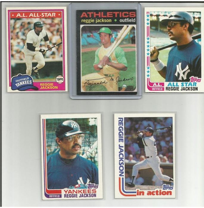 This lot includes a 3rd year 1971 Topps Card of Reggie Jackson, as well as three different Jackson cards from 1982 and a 1981 Topps All-Star Card. Lot is in Excellent or better condition.