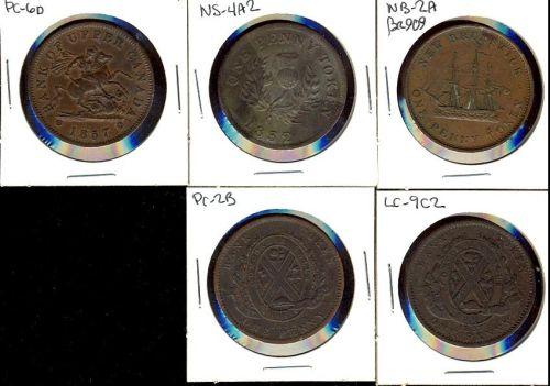 Lot of 5 different One penny tokens. NB-2a, NS-4a2, LC-9c2, PC-2b, PC-6d. Grades vary from F to AU. Catalogue Value: $350