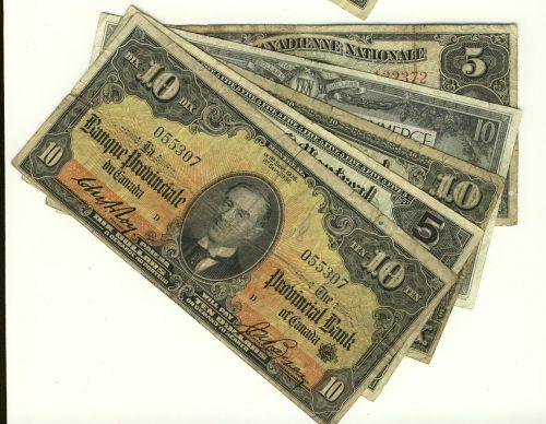 Lot of 5 different small size chartered notes including Bank of Montreal 1935 $10 1938 $5,, Provincial Bank 1936 $10, Banque Canadienne Nationale 1935 $5 Canadian Bank of Commerce 1935 $10. Grades vary from VG to Fine.