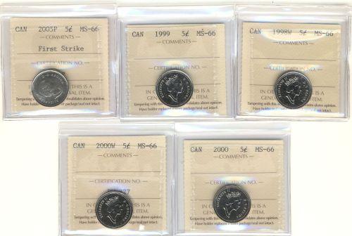 Lot of 5 high grade modern pieces including a 1998-W, 1999, 2000, 2000-W and 2005-P. All ICCS MS66