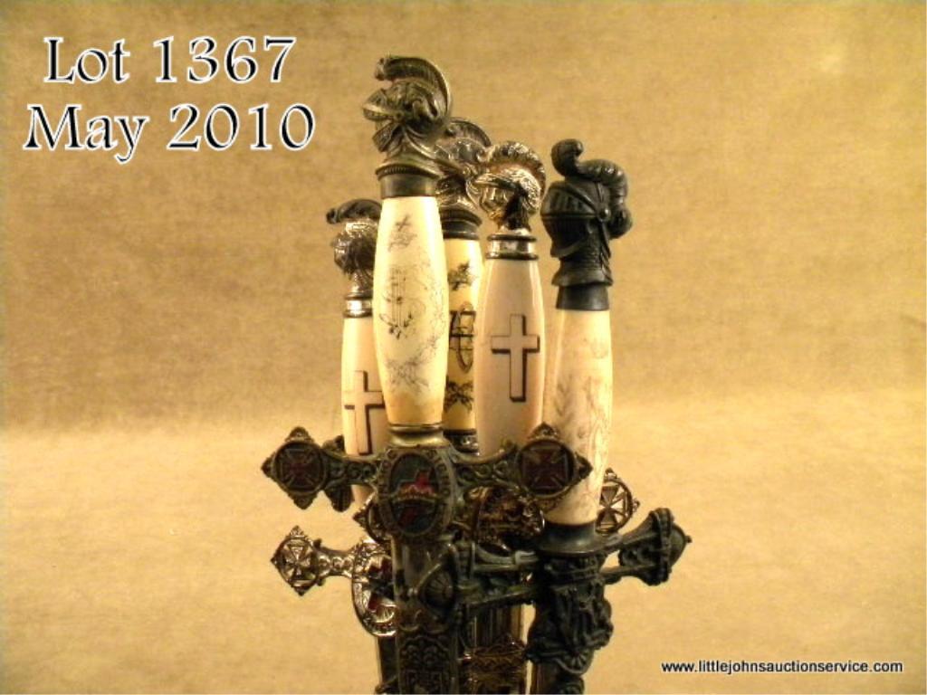 Lot of 5 lodge swords and metal scabbards from an old estate including a C.C. Ward in untouched overall good condition with “Harry T. Stump” etched on the blade and “HTS” etched on the bone-like grip with fancy mounts with gold washand green and red enameling; an M.C. Lilley & Co. in untouched good condition with “Clarence A. Crisman” etched on the blade and “CAC” etched on the ivory-like grip, fancy mounts on the scabbard; another MC Lilley in overall good condition with“Charles J. Pretzman” etched on the blade, “CJP” etched on the ivory-like grip and fancy mounts on the scabbard; an MC Lilley with “Bennett L. Williams” etched on the blade with “BLW” etched on the ivory-like grips with fancy mounts on thescabbard; a James Tuker with “Robert G. Newman” etched on the blade and “RGN” etched on the ivory-like grip with fancy mounts and uncleaned condition. Est.: $350-$700.
