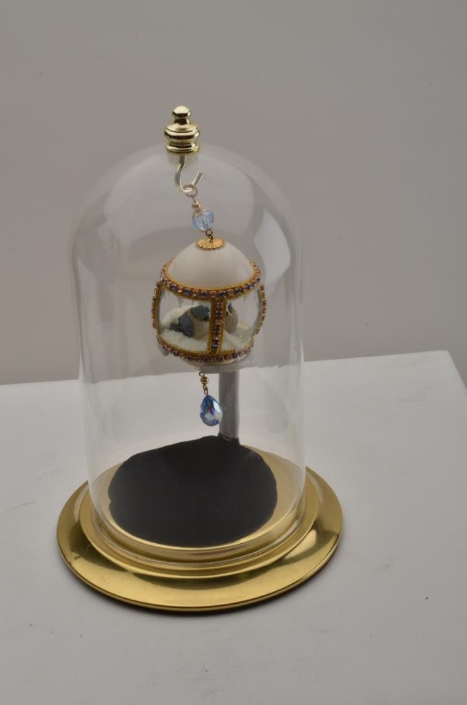 Lot of 5 misc. collectibles including a small Lladro duck, 2 porcelain hinged Versace Designs painted eggs; a painted long stem rose and a real egg carved out and decorated with two little bird inhabitants, allsuspended inside a glass dome on brass base. Est.: $75-$150.