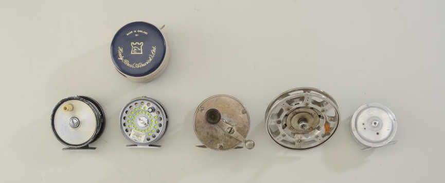 Lot of 5 misc. fishing reels one by Ocean City, an English Hardy Bros. in soft case, an antique fly reel, an old Pflueger and a small Edwards No. 30Est.: $200-$400.