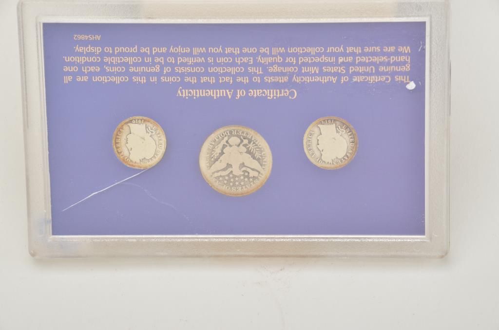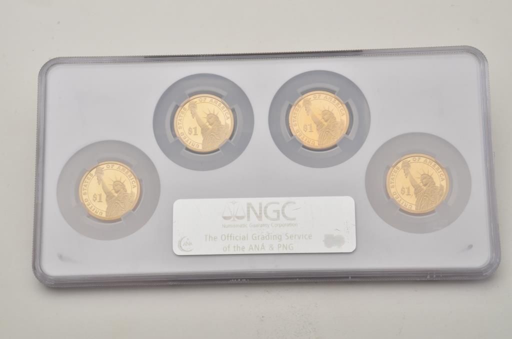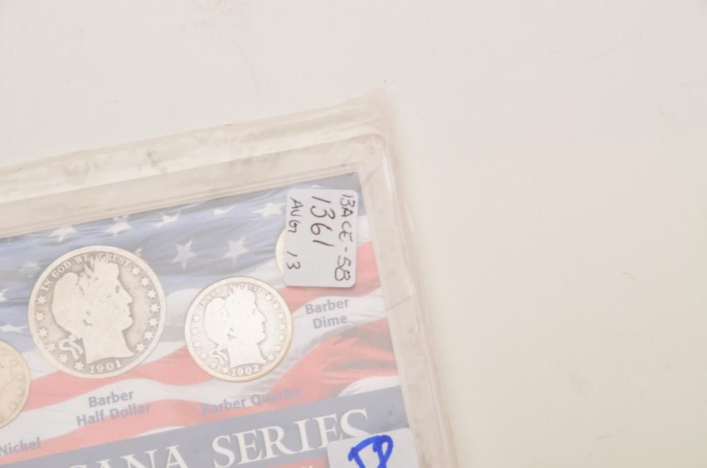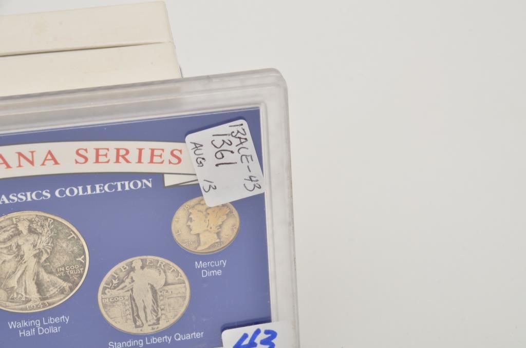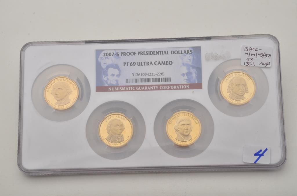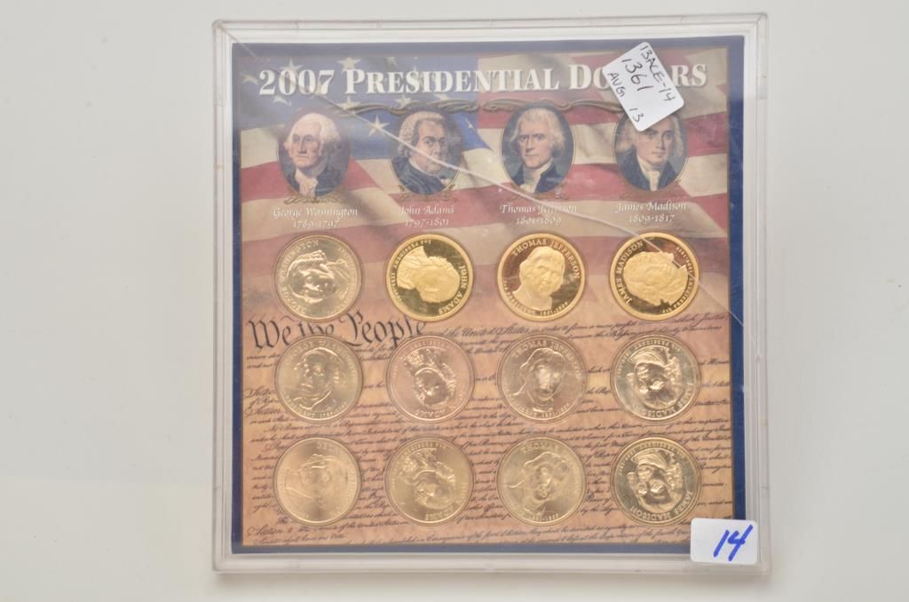 Lot of 5 misc. groupings of collector coins in protective cases including the Americana Series , “Vanishing Classics Collections” of 5 U.S coins; Americana Series, “The Yesteryear Collection”; a Barber CoinCollection of 3 U.S. coins; a 2007-S Presidential Dollars 4 Coin set and the 2007 Presidential Dollars 12 dollar coin set. Est.: $125-$250.